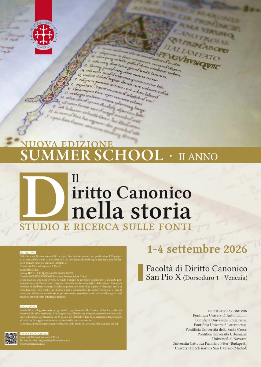 A settembre si svolgerà il secondo anno della Summer School sulla storia delle fonti. Il corso, articolato in un biennio, intende abilitare gli studenti alla ricerca storico-critica qualificata e fruttuosa. Esso si propone di offrire ai partecipanti un’adeguata conoscenza degli strumenti e della metodologia richiesta per lo studio dei testi  giuridici antichi, con una duplice finalità: educare ad una pronta sensibilità giuridico-canonica e fornire criteri ermeneutici validi per un’autentica intelligenza del dato positivo vigente.